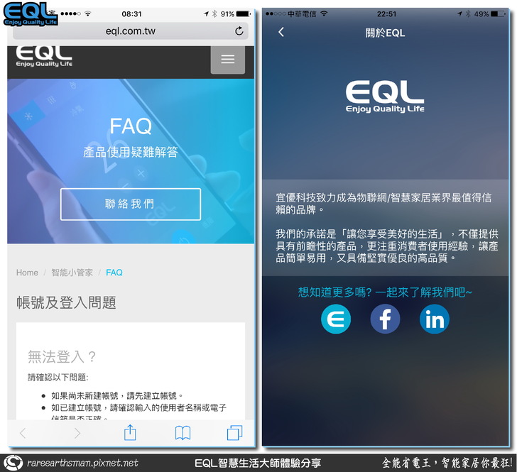 缺點部分,雖然許多的新產品還在設計中,許多功能還待升級,但是現階段智能小管家裡的產品還是不太夠,如果這時候像使用iOS的使用者可以在HomeKit內同樣的使用EQL的系統,也同時使用其他的智能系統,就好像HomeKit整合各家的系統,使用者只需要使用HomeKit這款APP就好,這樣的力量才會集中,操作也比較簡單;只是不曉得廠商有沒有類似的產品計畫。