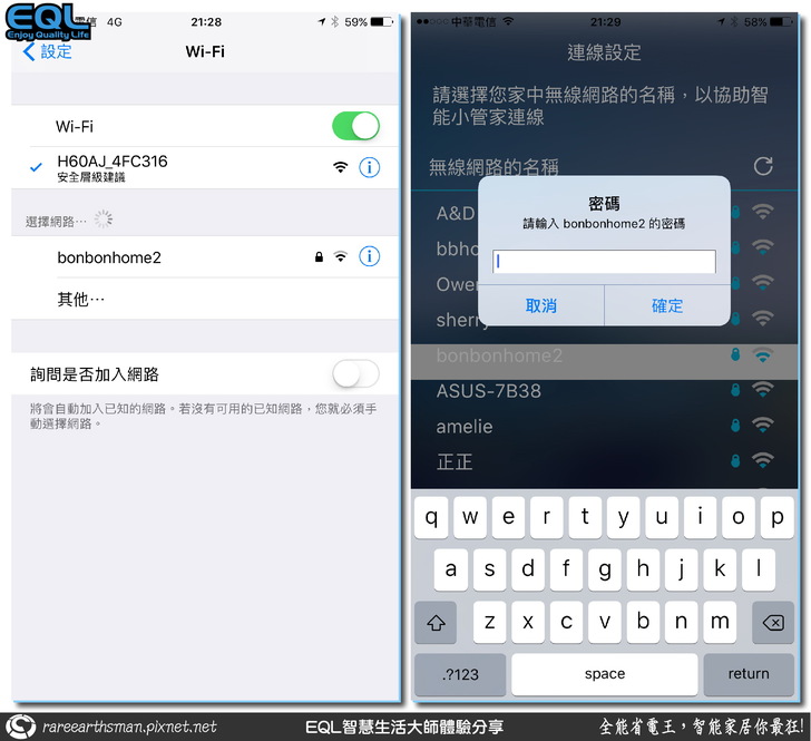 ▲左側是到手機WiFi連上H60AJ開頭的無線網路,不需輸入密碼。回到APP裡面,畫面會跳出無線網路的選單,選擇家中的無線網路然後輸入網路密碼。