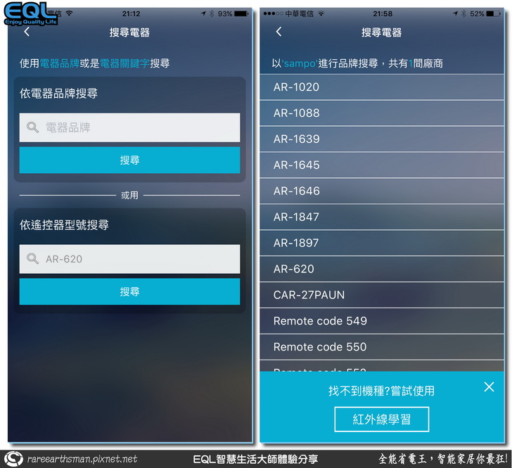 ▲這邊要特別注意一點,一台智能小管家只能使用紅外線功能設定各一台的冷氣、電視及電扇,沒辦法設定第二台,除非使用第二台的智能小管家了;另外遙控器的設定並不是以電器的型號來做分類,每家廠商的電器,通常好幾款機型會共用一支遙控器,所以如果搜尋電器型號是找不到的,必須要用遙控器型號才能搜尋到。以冷氣的連線設定來說,可以使用電器品牌或遙控器型號來做搜尋,像我家的冷氣是10多年前所裝的聲寶冷氣,這麼冷門以及舊款的冷氣應該是找不到遙控器了吧,因為我直接輸入遙控器的型號是找不到的,所以我就用品牌來搜尋,而找出了內建所有聲寶冷氣的全部遙控器型號,如右邊圖案。