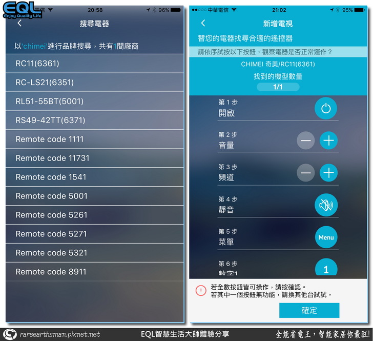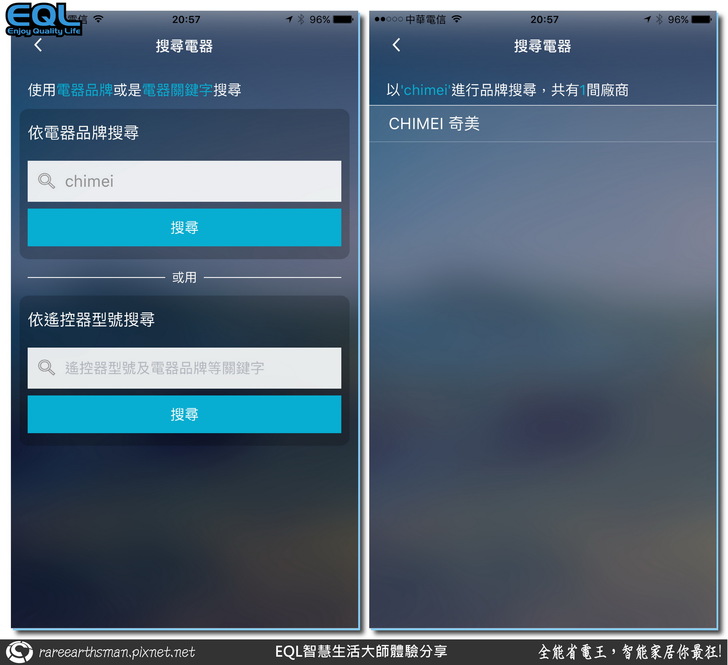 ▲跟冷氣遙控器的設定相同,可以使用品牌搜尋或是遙控器型號搜尋,像我輸入CHIMI,搜尋結果會出現奇美品牌選項。