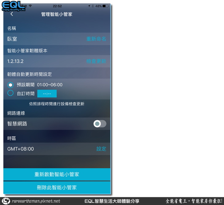 ▲管理智能小管家頁面,可以更改名稱、韌體更新、韌體更新時間設定與重新設定智能小管家。