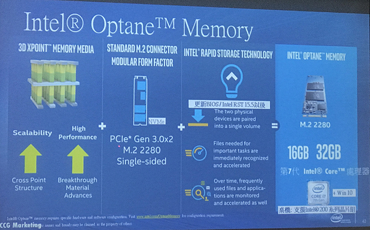 這個是Intel Optane Memory 技術的介紹簡報畫面;大家看看就好,重點是一定要透過Intel最新200系列晶片組、第七代CPU,以及Win 10 OS才能使用,而且要搭配HDD才有爽度!