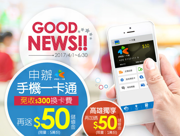 好康一、換卡即享免NFC換卡費$300+記名開通費$100,申辦再送50元儲值金(限量5萬份),限時優惠立即來參加!