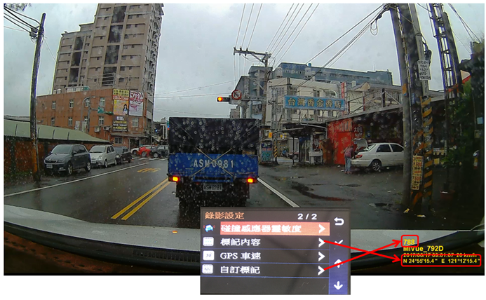 行車記錄器會顯示下圖例:下圖為由右側車道往左側車道是會顯示-表示你偏移左邊)