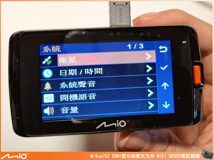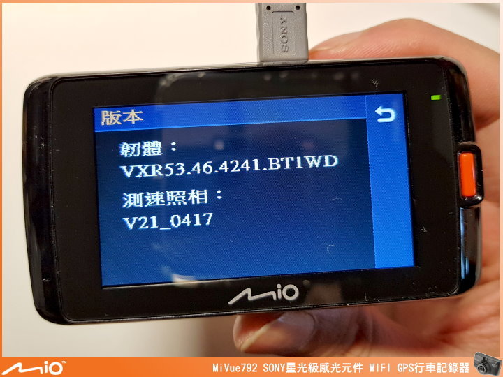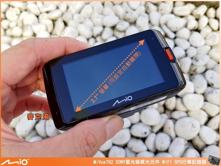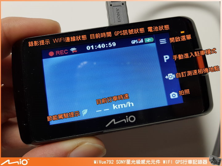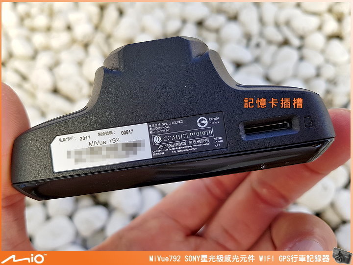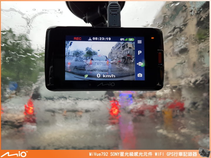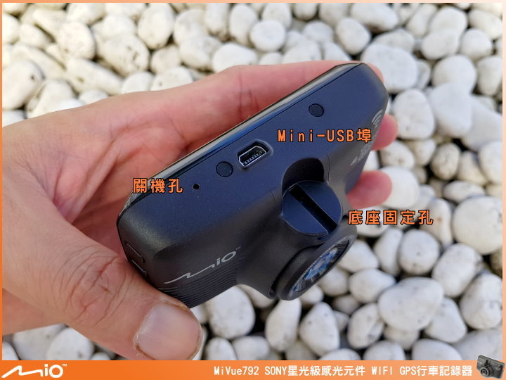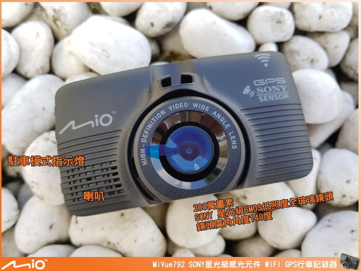 ▲近期 Mio 行車紀錄器的外觀長相都差不多,左上角有 WIFI 圖示,代表支援 WIFI 傳輸功能,GPS 圖示,代表有 GPS 測速相機提示、定位自動調整日期時間及行車軌跡的紀錄功能,MiVue™ 792 採用 SONY 最強 STARVIS 星光級感光元件,提高近紅外光的靈敏度能提供較一般感光元件高 4 倍的亮度,再搭配 F1.8 大光圈、全玻璃鏡頭及廣角鏡頭角度 140 度,能在低光源的情況下還是有辦法將影像拍得清晰。機身尺寸:90.2 x 49.0 x 35.2 mm。重量:109g。