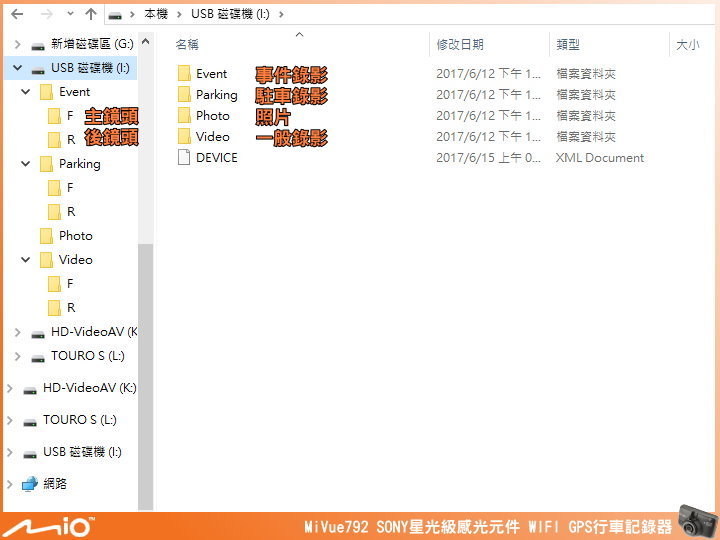 ▲電腦上讀取影片也相當方便,只要將 MiVue™ 792 接上電腦 USB 埠即可在我的電腦中顯示磁碟,資料夾也按照(一般影片/事件影片/駐車影片/照片)分類,影片資料夾內還分成主鏡頭及後鏡頭的影片保存。
