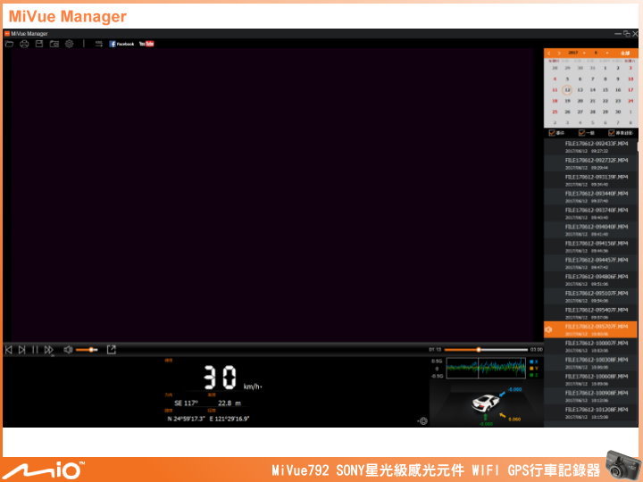 ▲電腦安裝 MiVue Manager 軟體後,可播放檢視紀錄的影片,並能提供內建 G-sensor 碰撞感應器個軸變化、車速、經緯度座標、Goolge Map 的行車路線資訊。