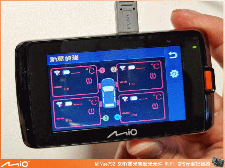 ▲內建胎壓偵測顯示,需另外選購 Mio 胎壓偵測配件(MiTIRE T25KIT),連接後可於螢幕顯示四個輪胎胎壓的狀態,提供更完善安全的行車資訊。