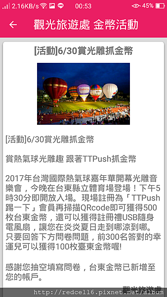 【▼】TT-PUSH (踢一下)推廣活動搭配2017臺灣國際熱氣球嘉年華在每場熱氣球光雕活動TTPush(踢一下)推廣攤位民眾只需要現場註冊成為會員,不但可以拿到專屬註冊好禮桃紅色限定USB隨身電風扇,掃描活動現場專屬QR碼完成報到,即可立即獲得五百枚台東金幣!金好康!