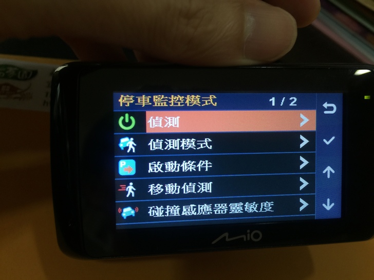 長時間車輛未移動就會自動進入駐車錄影模式,右邊有個條狀物似乎是偵測感應顯示,不過是移動偵測還是碰撞偵測我看不出來?