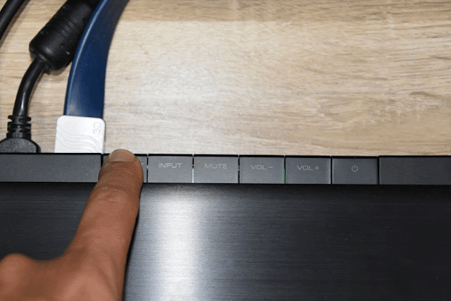 ▼ 主機接好 HDMI 後,剛放要放到液晶電視機前面時,因為我的液晶電視底座很低,我很擔心 YSP-2700 會擋到我的螢幕下緣。