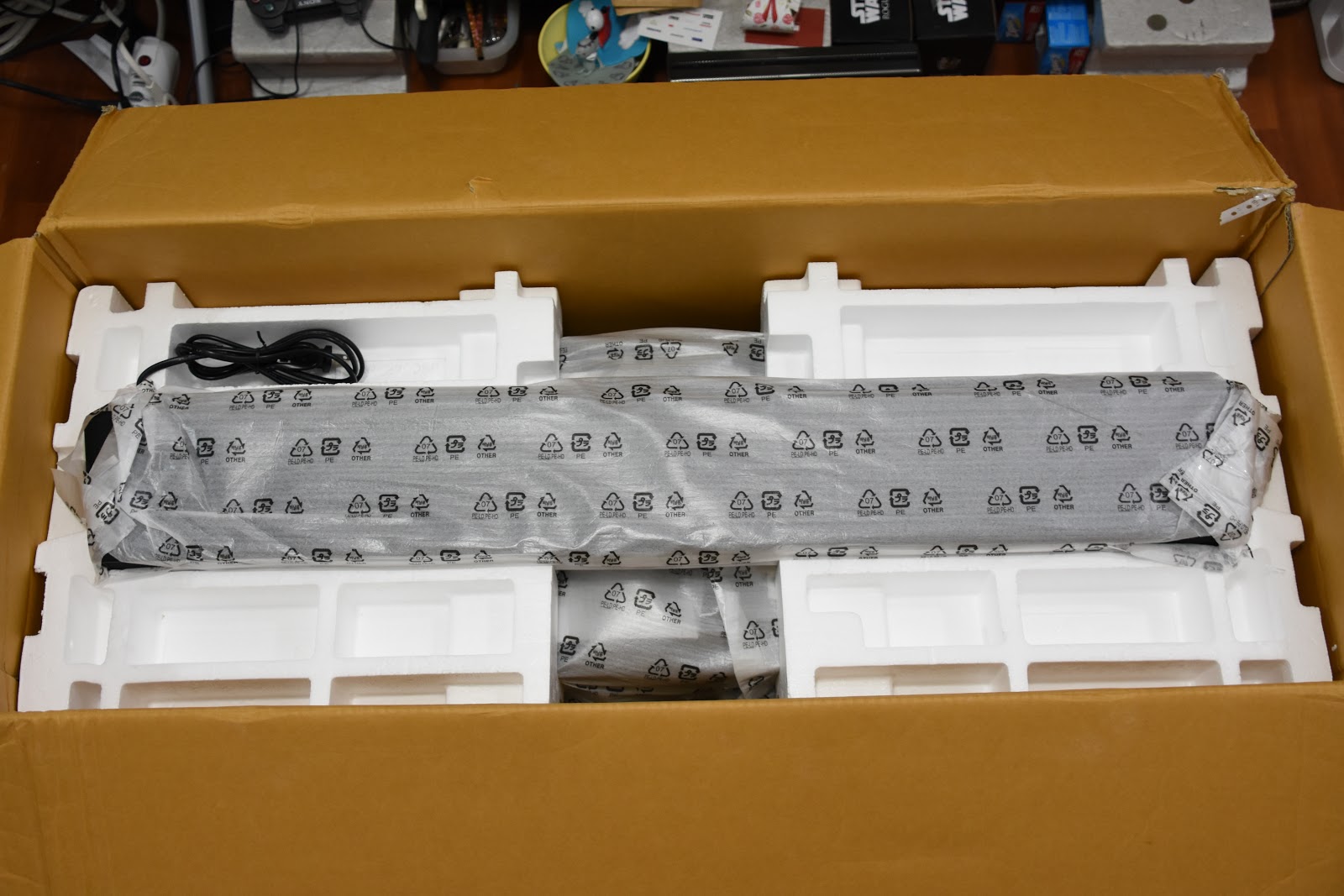 ▼ 打開後的第一層,可以看到有遙控器、說明書、光纖傳輸線、兩包被泡棉包住的東西和一個不知道做什麼的三角形紙板。