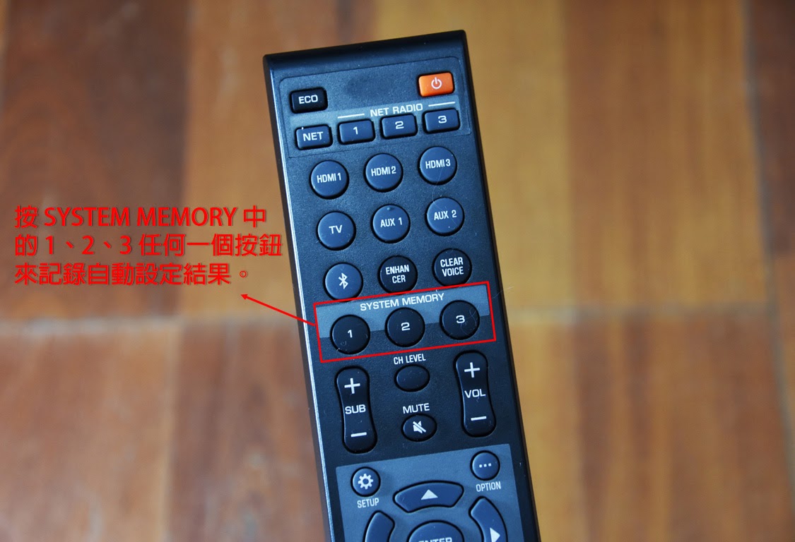 ▼ 這時按下 SYSTEM MEMORY 中的 1、2、3 任何一個按鈕來記錄自動設定適當的環繞效果(IntelliBeam)的結果,我選擇 3 來按,按住約 3 - 5 秒就可以了。