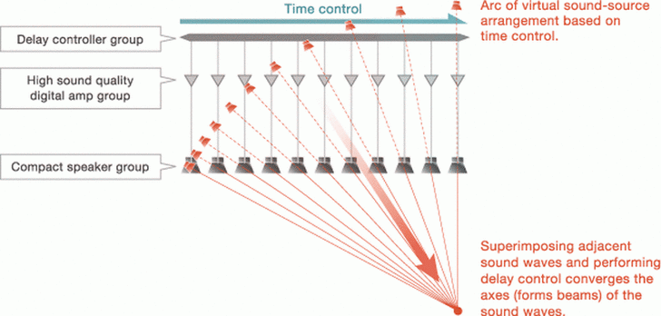 每兩個鄰近單體發出的音波互相堆疊產生交錯,如果單體交錯的區域增加,音波堆疊的效果大幅增強,產生不一樣的音波,我們稱為音束。