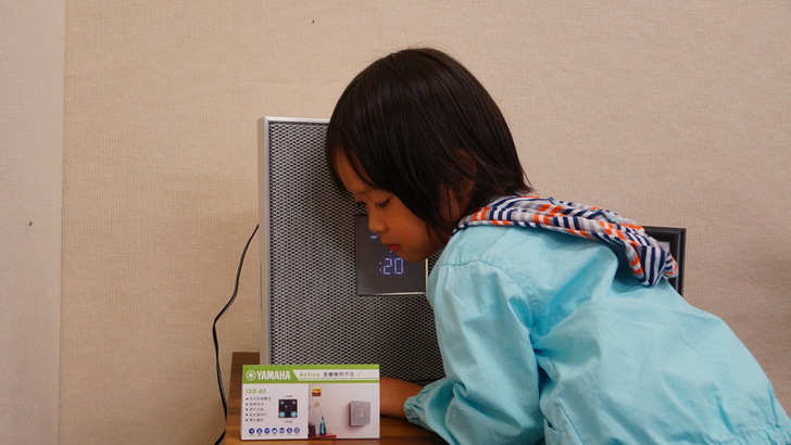 YSP-2700播出音樂不意外,但是切換到ISX-80播出音樂的時候,大家都嚇了一跳,原來ISX-80就是視聽間裡最後方一台很像時鐘又很像相框的東西,根本沒有人注意,等到發出聲音回頭張望的時候,大家才知道原來這裡藏了一台搭載MusicCast功能的Yamaha產品啊。有個參加體驗會的網友,他帶了女兒來,女兒立刻湊上前去,想必她也被這台ISX-80所吸引了啊。