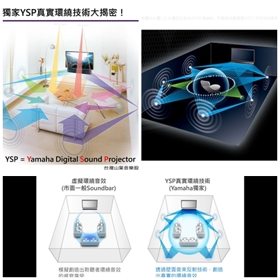 YAMAHA 獨家技術:YSP:真實的環繞技術,實際相處七天,真的很有環繞的感覺,沙發上坐滿四個人,聲音的定位都還是有唷!