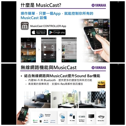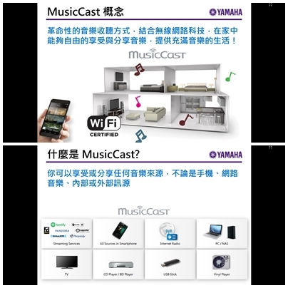 創新殺手級軟體應用:Music Cast,只要下載Music Cast App,只要有支援YAMAHA的Music Cast功能,在無線網路的覆蓋範圍內,用這APP可以從客廳走到廚房,廁所走到浴室,書房走到後陽台,音樂都不間斷,還支援高解析音樂唷,而且很穩定,不會突然斷線。