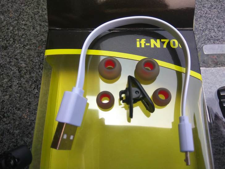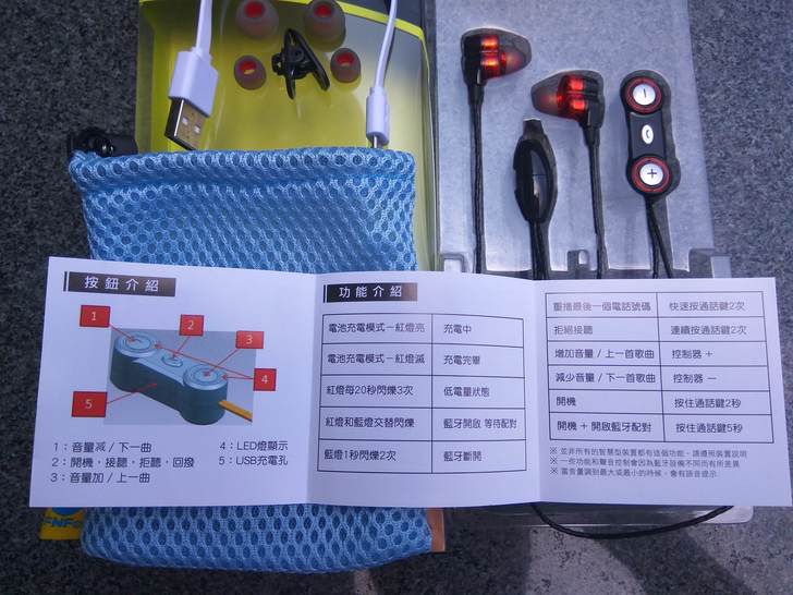 ▲正式開箱了,除了耳機主體外,隨附了收納袋、2組不同大小的耳塞、充電線、與夾扣。