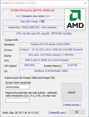 跑個FurMark極限溫度 3 風扇開轉 77 度