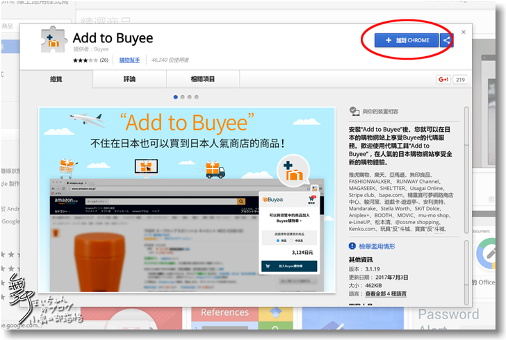 ▲這時會進到CHROME商店裡進行『Add to Buyee』購物插件的確認,按下右上方的《加到CHROME》就能下載並安裝。