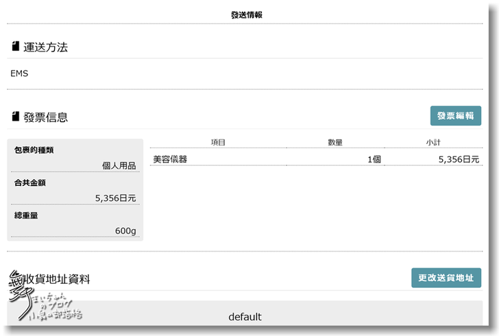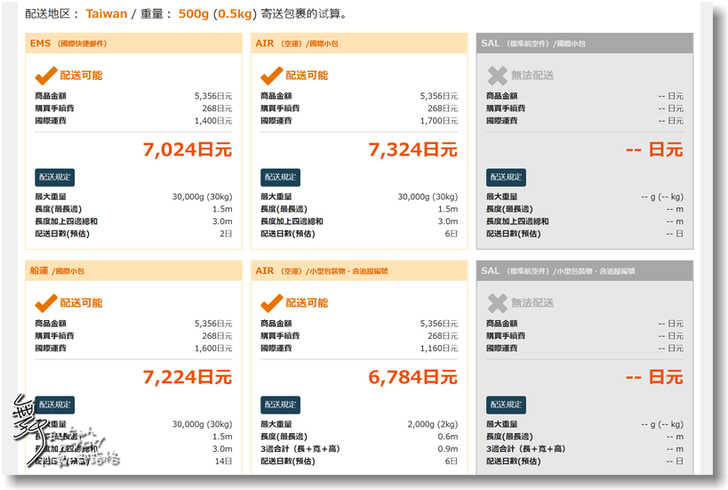 ▲我試著把上加包裝盒的重量為500克,試算工具就列出各種運送方式所需的費用,大概在七千日幣就能買到台幣約3480的商品真划算,透明化的列表讓所有開銷一目瞭然。