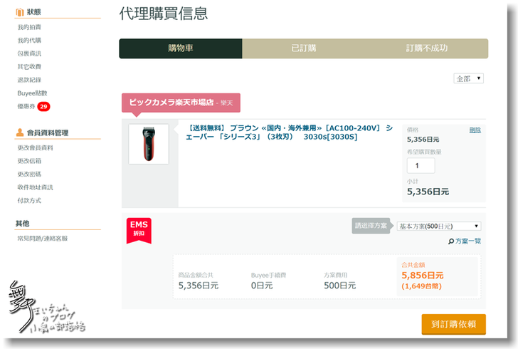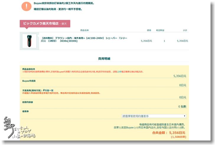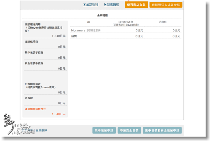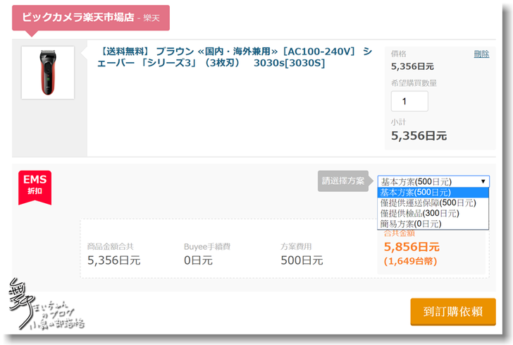 ▲因為我常買BIC CAMERA的商品,所以我還蠻信賴他們的品管,加上是屬於代購方式,所以我並沒有加購檢品或運輸保障等方案,所以是選擇是簡易0元方案。。
