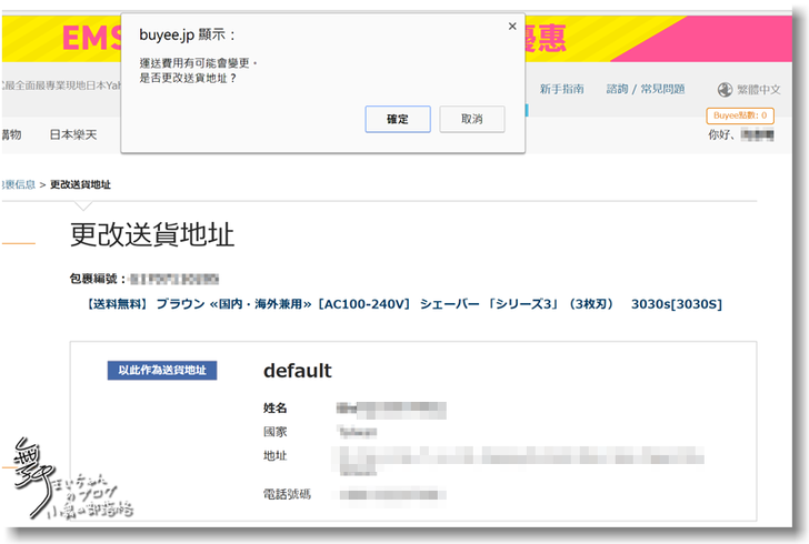 ▲系統會自動以註冊時填寫的寄送地址做為寄送的依據,如果要變更也能在此辦理,Buyee也提醒變更地址有可能產生運送費用的不同喔。