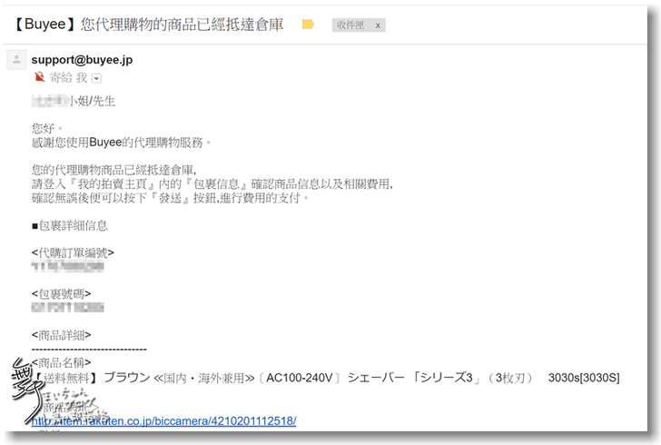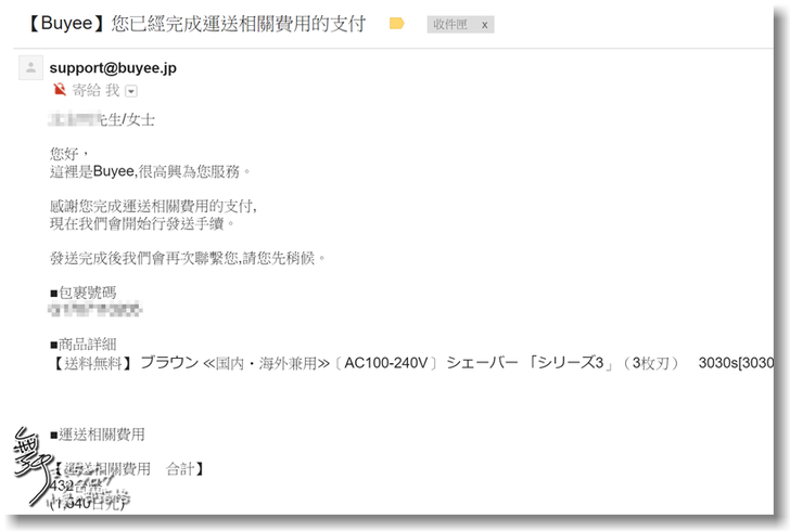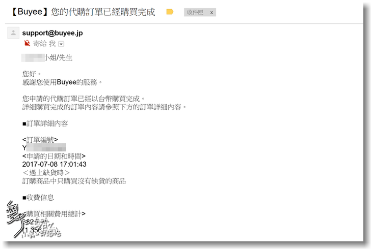 ▲約莫一天時間就收到Buyee代訂購商品的通知,這時就可以安心等候寄送了。