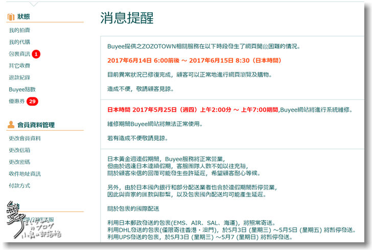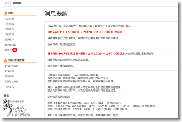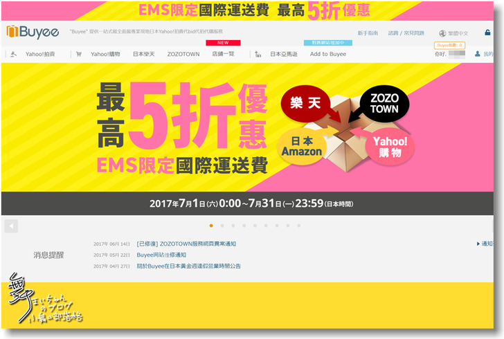 ▲購物前先來看看網站裡的一些重要資訊,這樣才能更順暢的完成購買;Buyee有任何的促銷或通知,會在『消息提醒』裡顯示,購物前可以先來這邊看看有什麼好康消息。