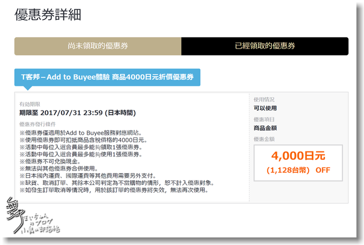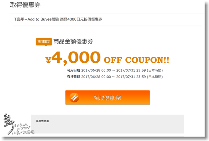 ▲這次的T客邦「超限額體驗日本無時差血拚團」就有提供一張超划算的4000日元優惠券可以使用,立馬來領取。