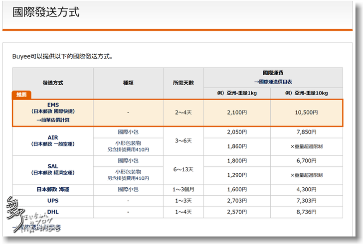 ▲而想要了解各種國際運送的差異,Buyee也有清楚的列表可查閱。