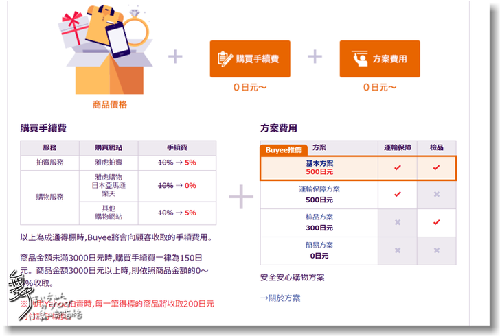 ▲除了商品本身的價格,透過Buyee代購還會有一些費用,如代購代標手續費和安心購物方案。