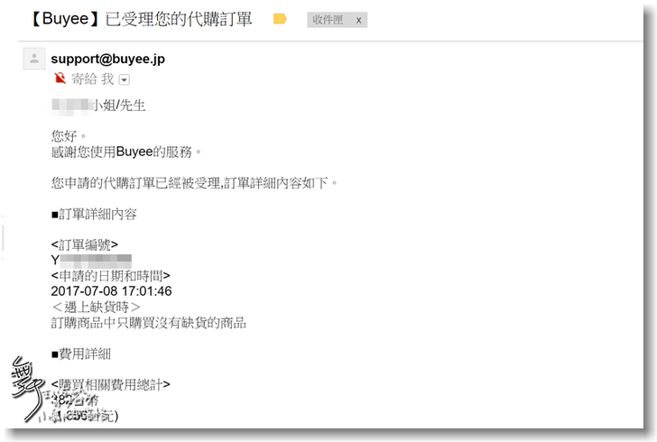 ▲Buyee系統會回覆接受訂單的訊息,可以安心等候商品寄到台灣。