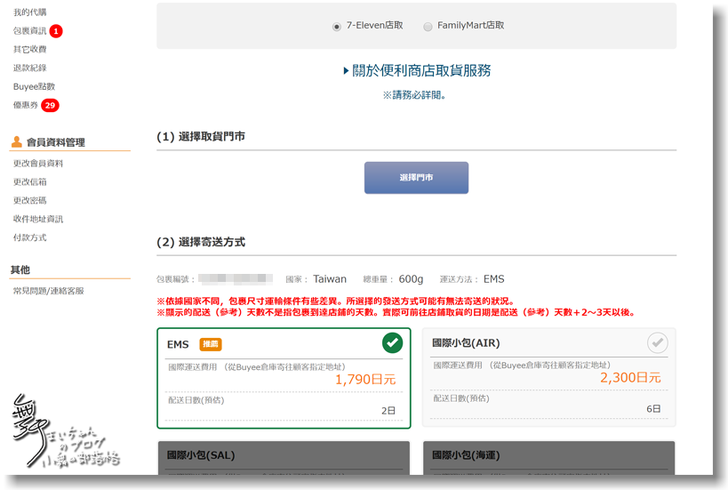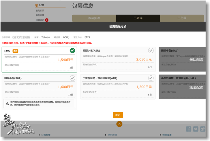 ▲費用差不多的情況下,我選擇最快速的EMS快捷郵件,只要2天就可以抵達台灣。