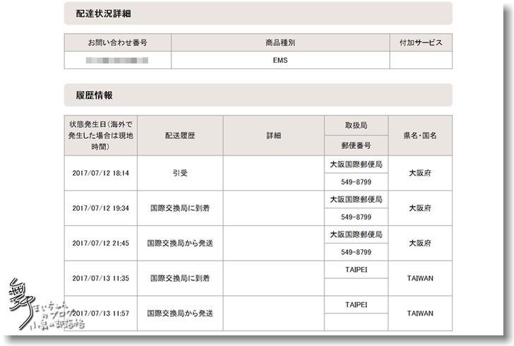 ▲從7月12日郵局窗口收件,當天晚上抵達日本郵局的國際交換所,7月13日上午就到台灣了,速度真是快。