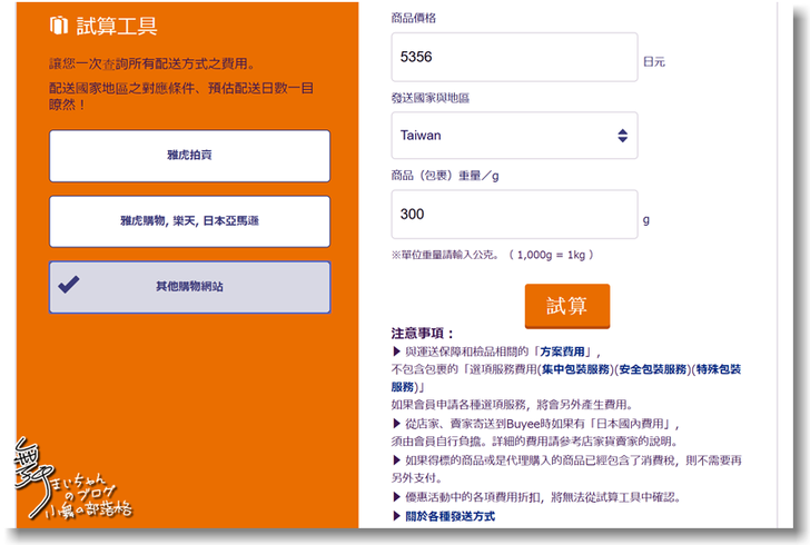 ▲在Buyee裡有著試算工具,選擇購物網站與商品價格、送貨地區、商品重量後,可以試算所有的費用。