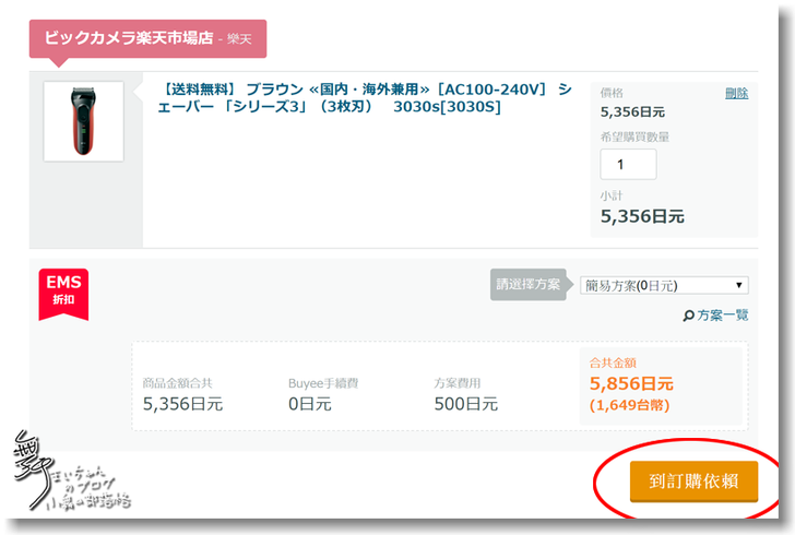 ▲確認商品價格並選完方案後,就可以委託Buyee購買了,這時可以看到右下方的《到訂購依賴》按鍵,點下去就對了。