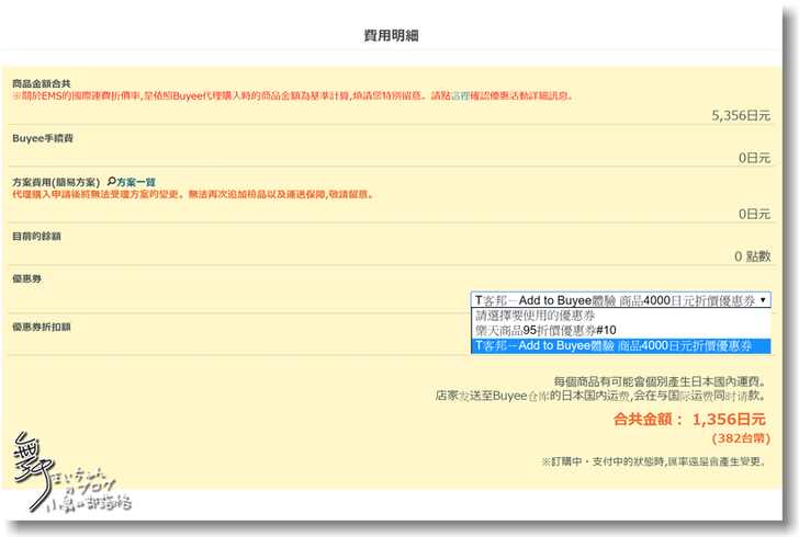▲《到訂購依賴》就是確認要委託Buyee進行購買或下標的動作,再度確認內容無誤後,就要開始選擇優惠券來佔便宜的時候了。