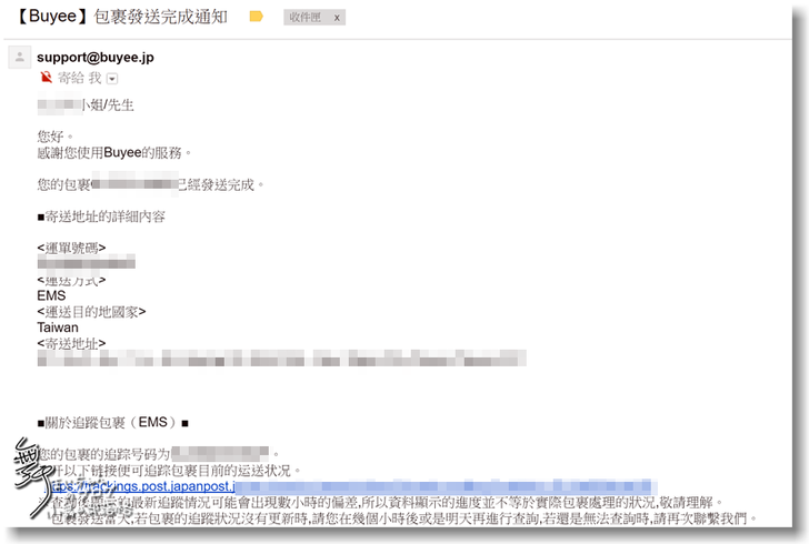 ▲並且在寄出商品時還會有一封寄送完成的通知,我是採用郵局的EMS來寄送,所以信件裡也有相關的郵件查詢編號供我們隨時追蹤流向。