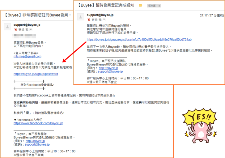【▼】若未點擊Buyee寄來的確認信,身份暫時還是為臨時會員,點擊認證後,就會變成正式會員,所有Buyee的功能都會解禁,信中也寫到會不定期在臉書上發布各項優惠促銷,有興趣的粉絲一定要去按個讚~ https://www.facebook.com/Buyee.jp ~