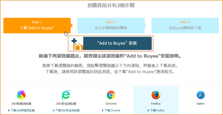 I.您目前使用的瀏覽器不支援「Add to Buyee」的安裝,目前可以安裝「Add to Buyee」的瀏覽器為:Chrome、Firefox、Safari、360等。