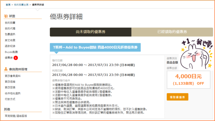 【▼】回到優惠券的部分,這次Buyee特別與T客邦合作,讓網友們能夠體驗Buyee與其他代購平台的不同,直接給予4000日元的優惠券(價值約為1133台幣),真是太佛心了拉~