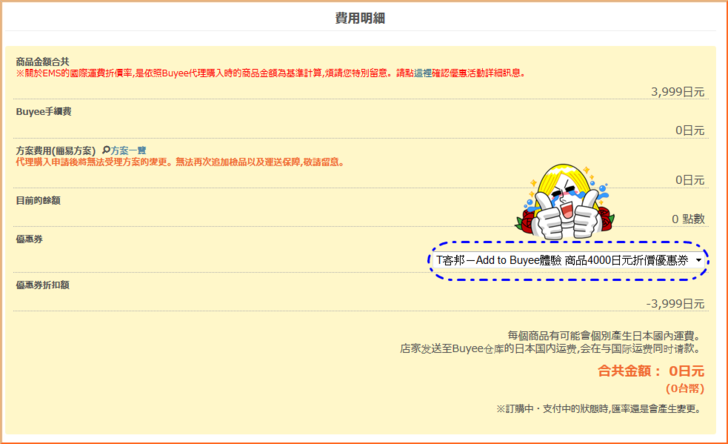 【▼】由於小編是使用T客邦的4,000日元的折價券,所以要在費用明細優惠券的的地方要下拉選擇。