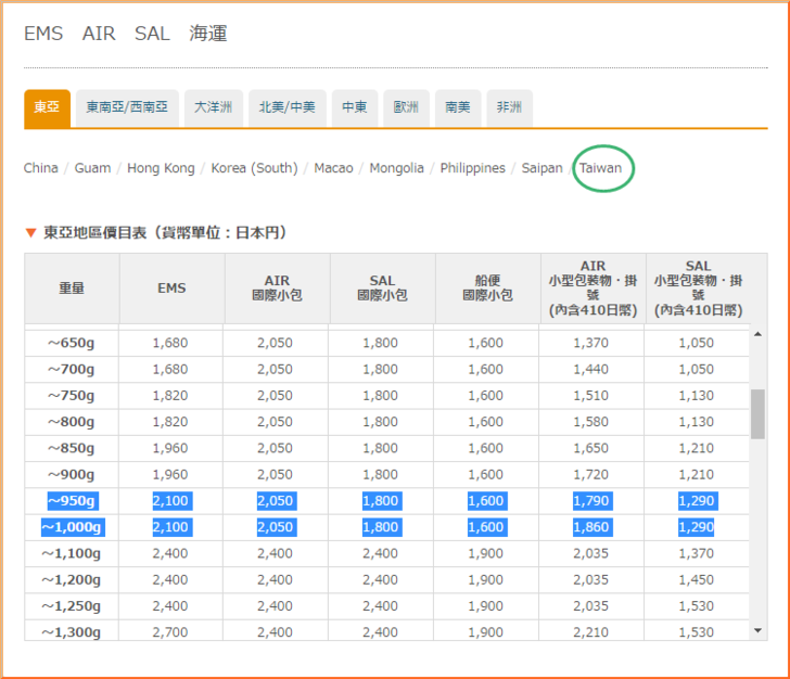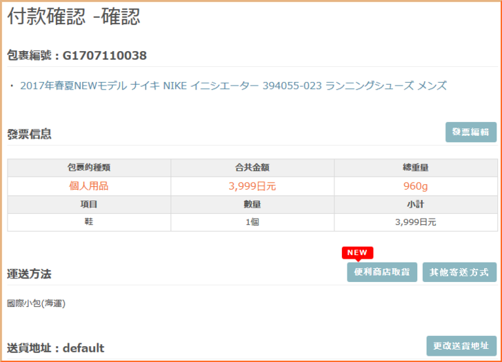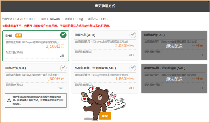 【▼】EMS、AIR、SAL、海運四種運送方式會以1kg作為一個臨界值,超過1kg就會加價,小編買的運動鞋含包裝共960g,選擇海運才1600日元,真的還蠻划算的。