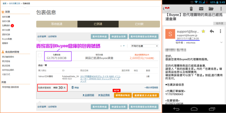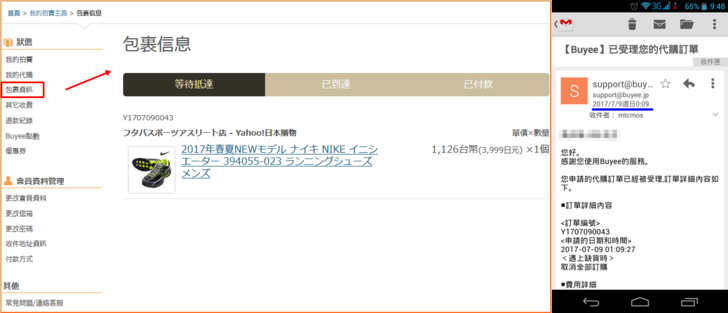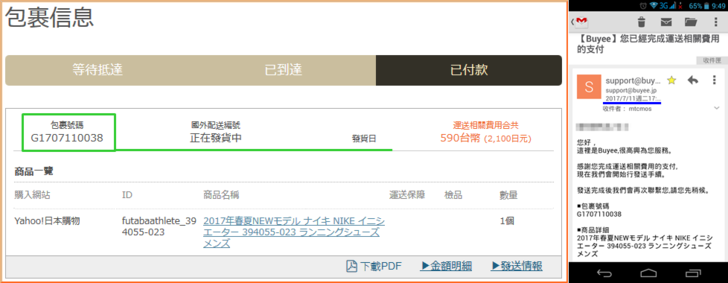 【▼】信用卡扣款後,"包裹信息"的狀態也從 "已到達" 轉成 "已付款",之後就等Buyee發貨至國際海運了。