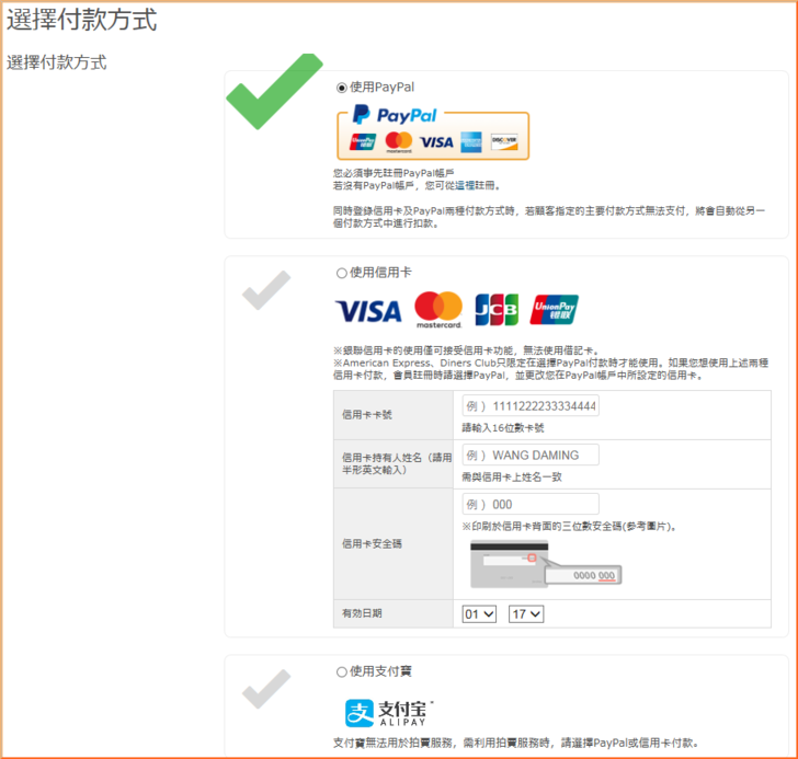 【▼】Buyee提供了三種付款方式,有支援 25 種貨幣的PayPal、四款信用卡(VISA、mastercard JCB、銀聯等)以及對岸愛用的支付寶,其中支付寶不支援拍賣服務,要搶標的朋友要注意。