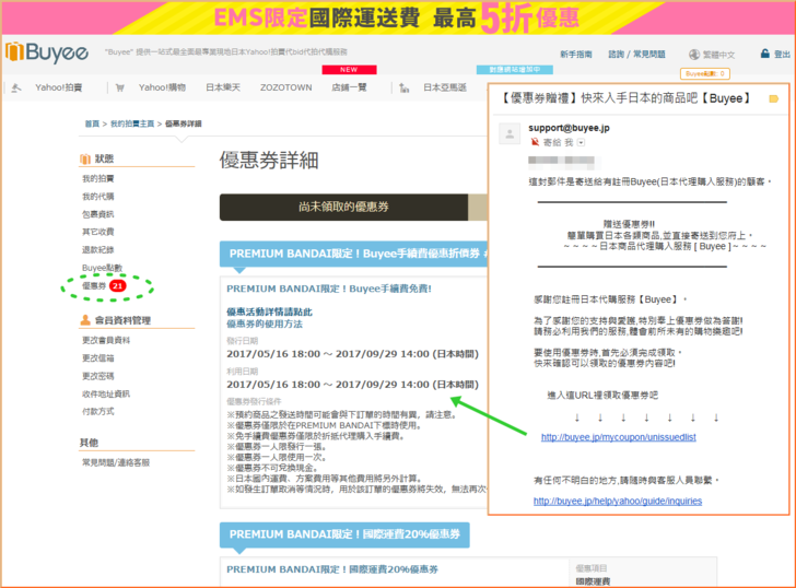 【▼】而Buyee真的很大方,註冊沒有多久,又收到Buyee寄來的優惠券,高達21筆的優惠,真的讓人爽買到嫑嫑的。