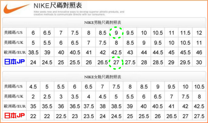 【▼】小編目前穿的運動鞋是屬於美規9號,這次購買日貨就要看日本的尺寸,對照下來相當於日本的27號。附上Nike運動鞋男女生的尺碼給大家參考~