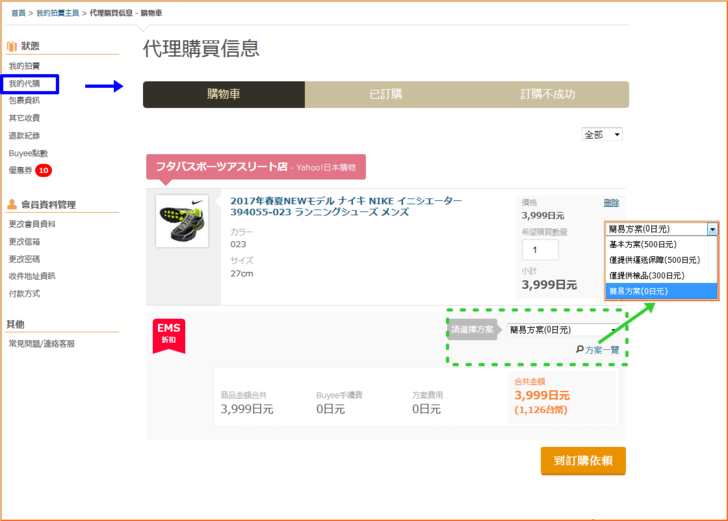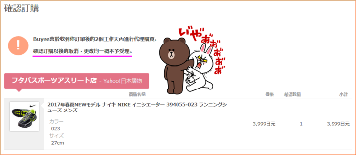 【▼】小編沒有選擇任何方案,所以沒有額外多出的Buyee手續費與方案費用,就商品金額3,999日元整。點擊 "到訂購依賴" 就會來到商品確認訂購的頁面,這邊要注意的是您下單後,Buyee兩天內就會進行代理購買的動作,屆時就不允許取消訂單了。