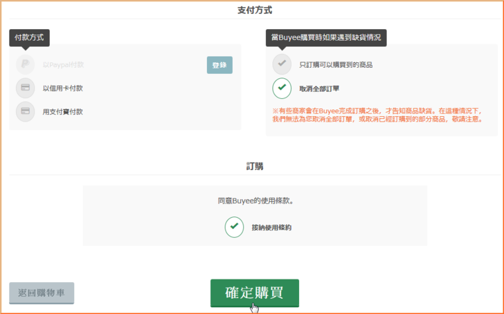【▼】而最後的支付方式依舊有Paypal、信用卡與支付寶三種,貼心的是若遇到商品缺貨的情況時,可選擇只訂購可以購買的商品或是訂單全部取消,最後確認無誤時,就可勾選接納使用條約,確定購買了!